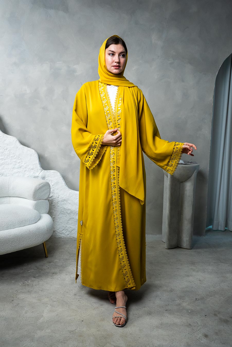 Gracefully crafted, This Mustard abaya features same-colour Dantel detailing for a refined, cohesive look. The subtle klosh adds a gentle flow to the silhouette, combining elegance with comfort. Made from a versatile fabric suitable for both summer and winter.