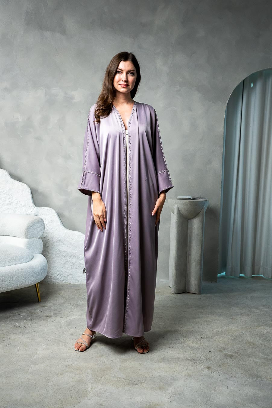 This graceful abaya features subtle handwork on the sleeves and a matching touch that flows gently down the front. With its minimal embellishment and timeless design.