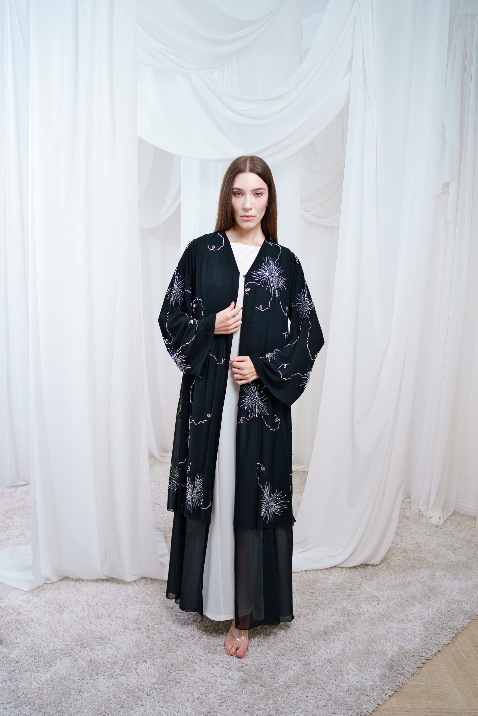 Light and graceful, this abaya is crafted from soft chiffon for a flowing, airy silhouette. Perfect for adding effortless elegance to any occasion.
