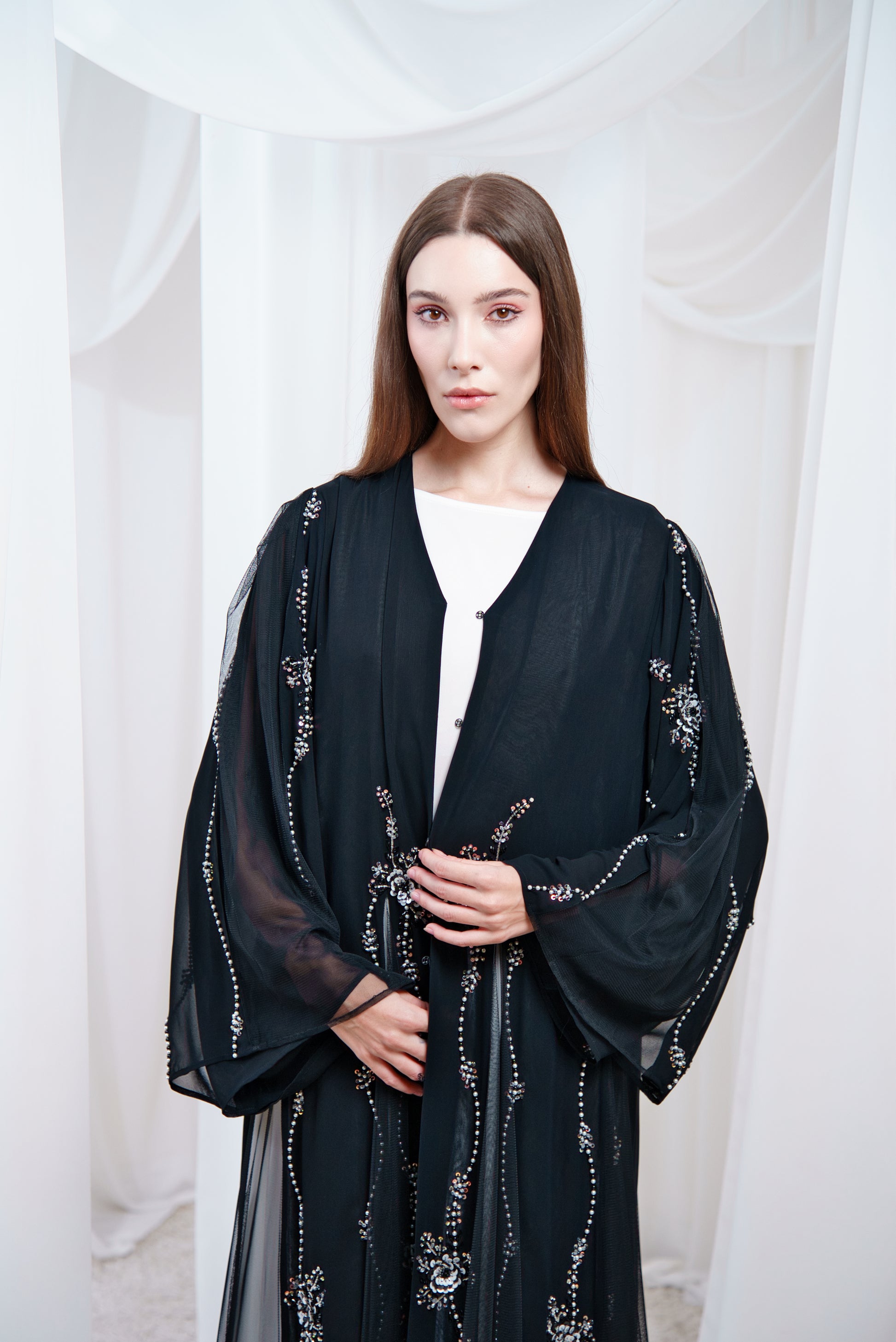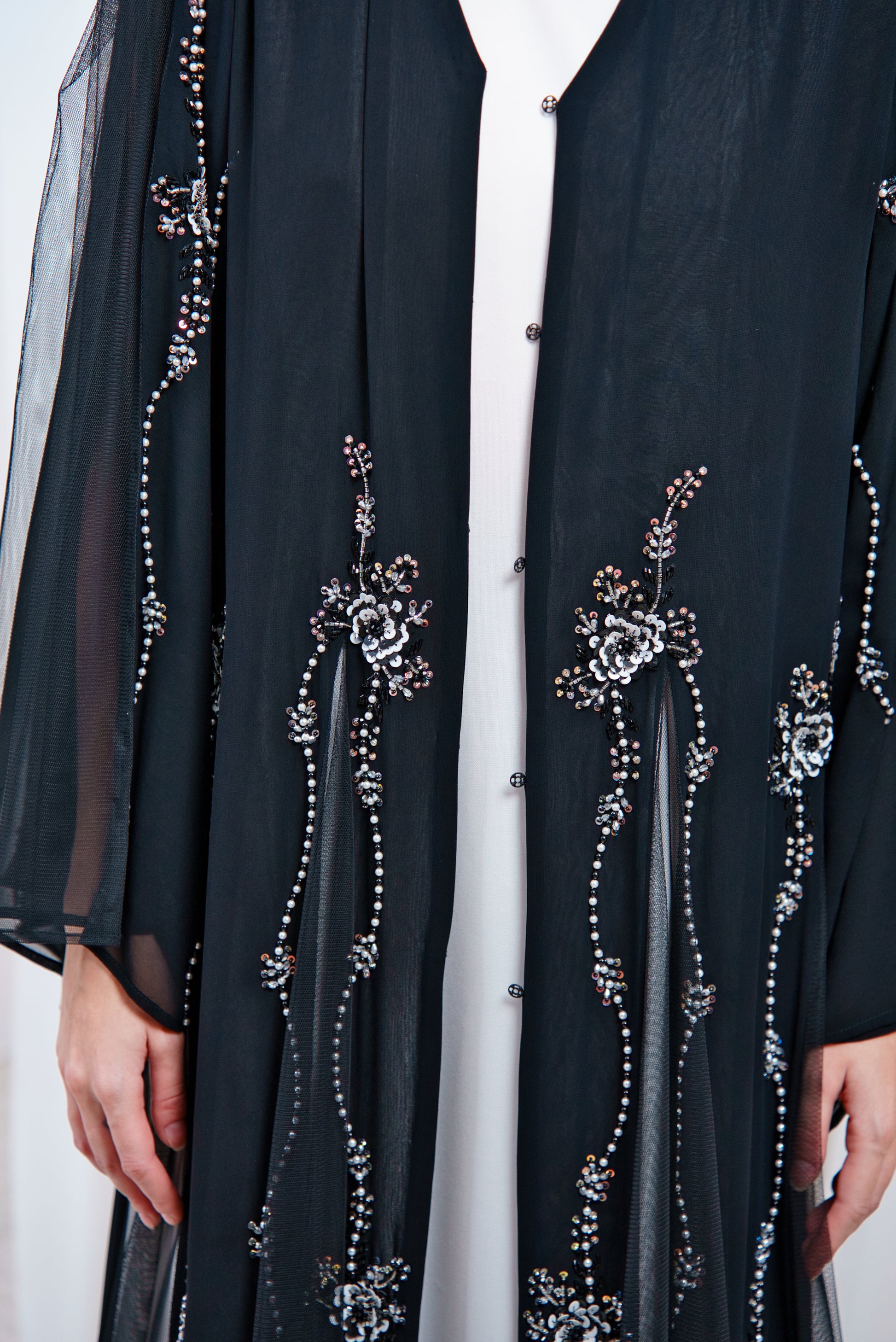 Abaya detailed with soft tulle and delicate beadwork, creating a graceful and refined look.