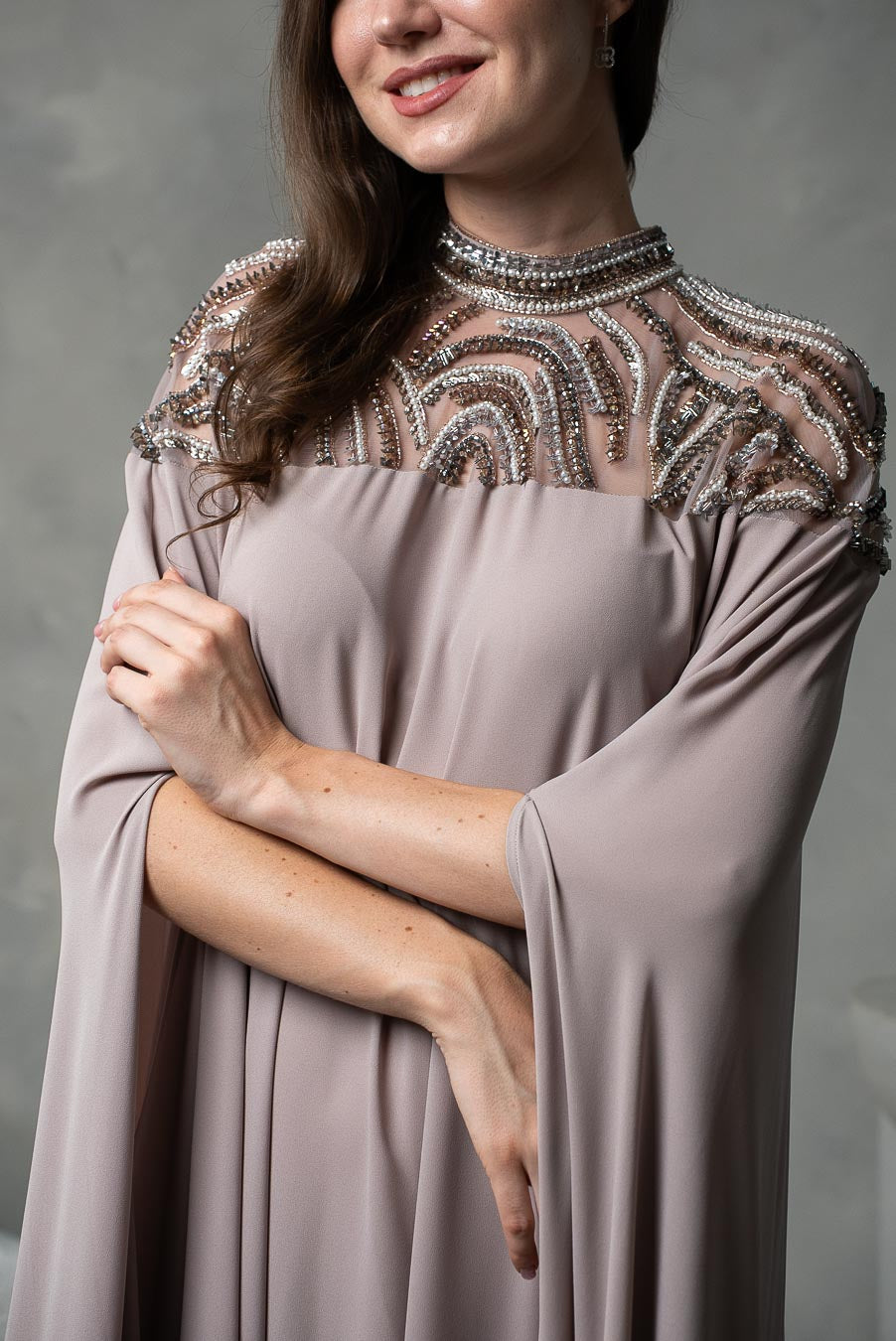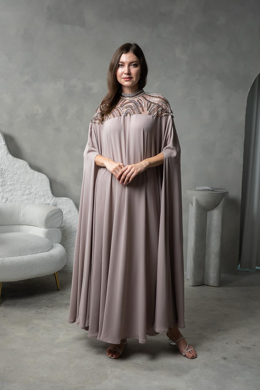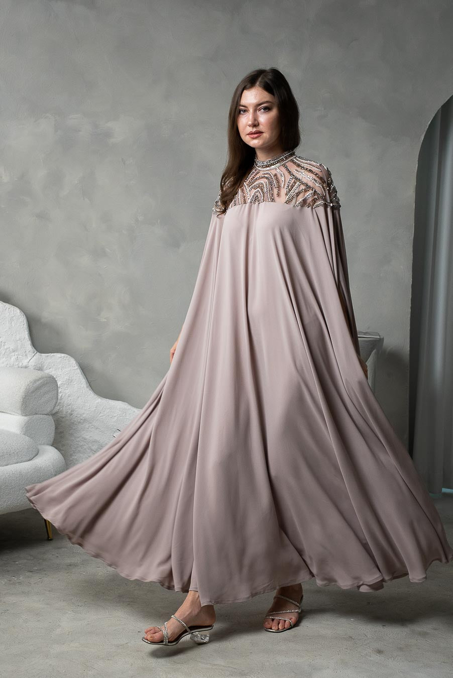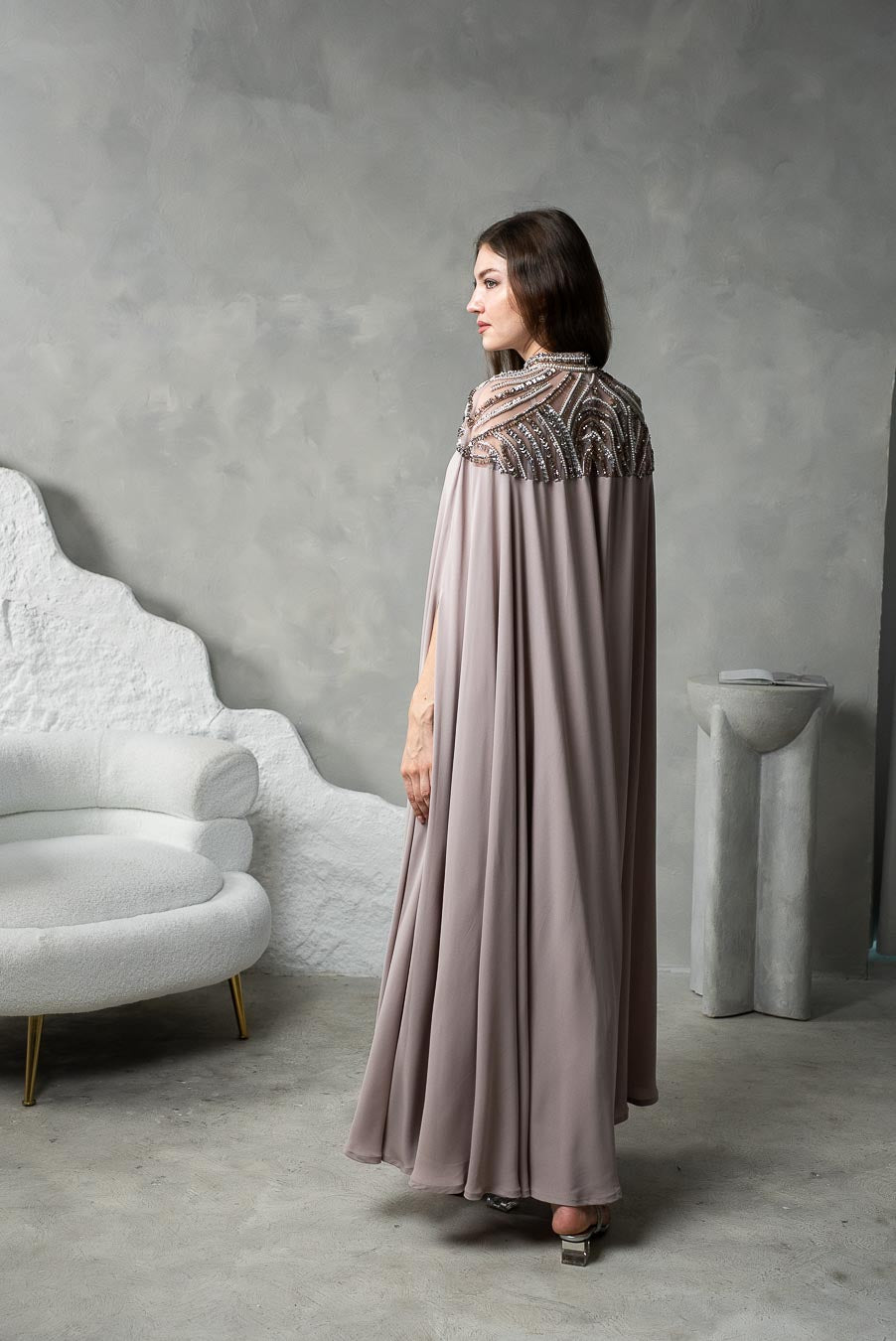 Crepe jalabiya with a flowing cape cut and handworked tulle detailing at the top for a soft, ethereal finish.