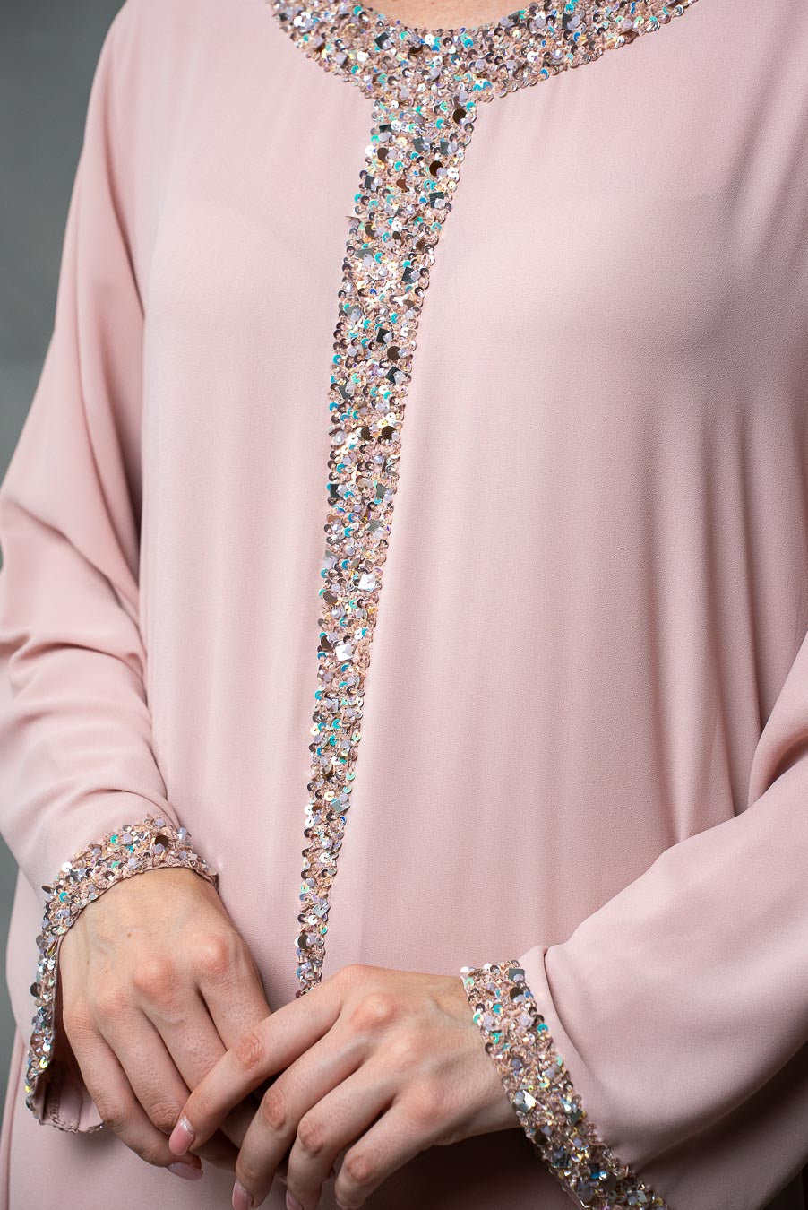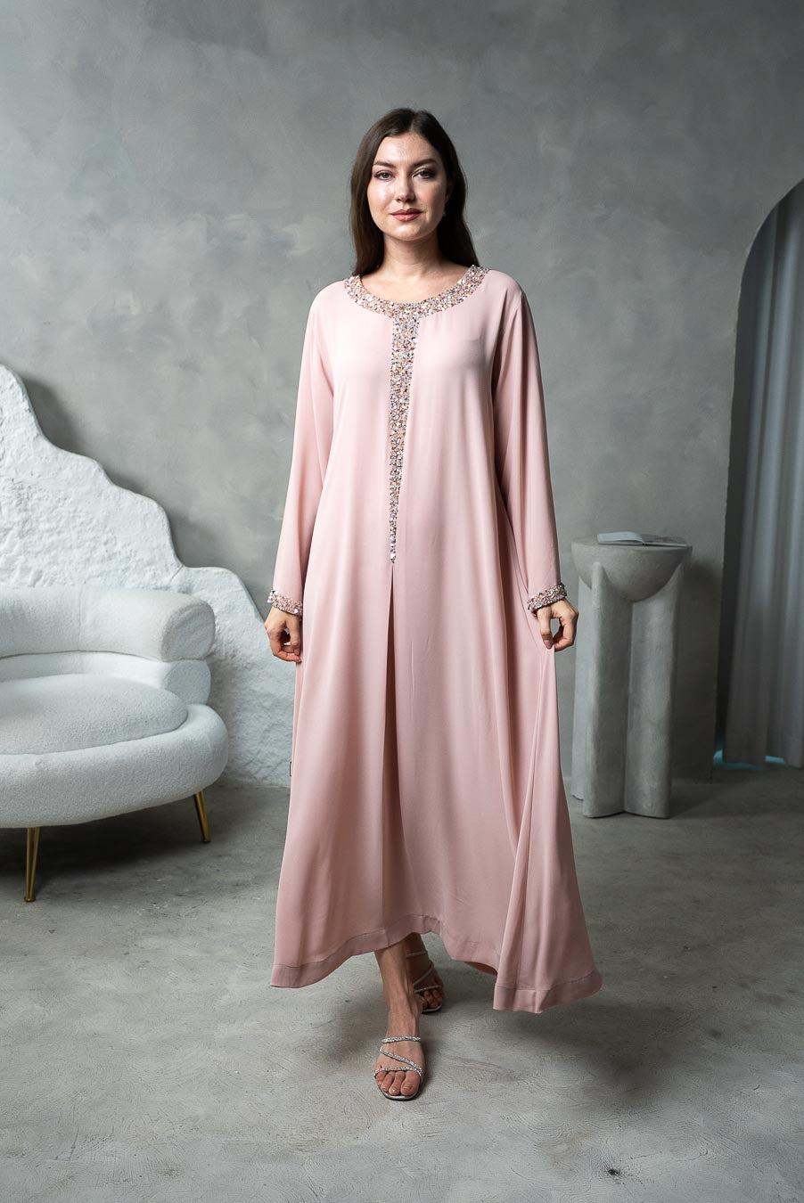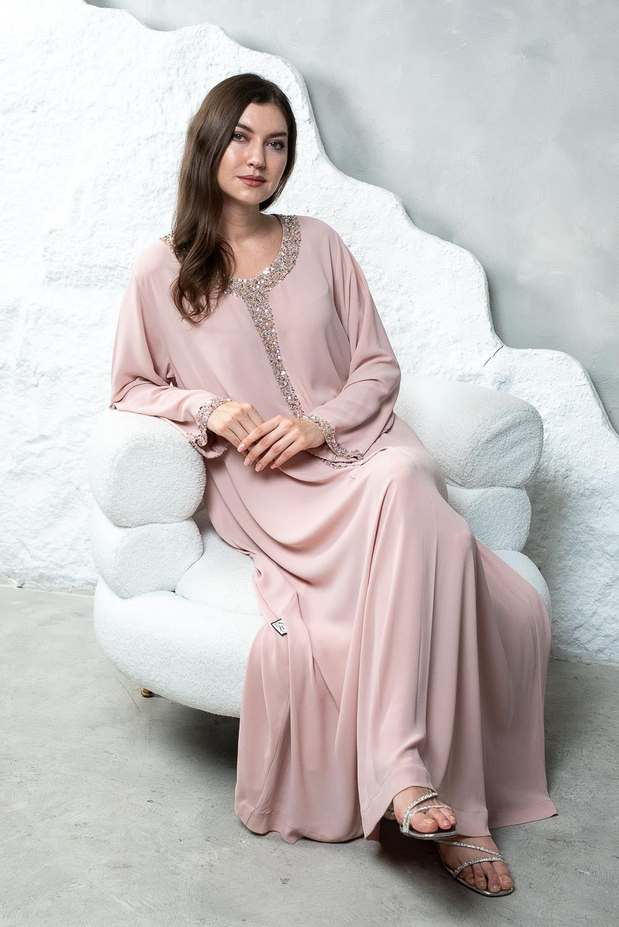 Crepe jalabiya with a klosh cut, featuring subtle handwork on the front, around the neckline, and sleeves.