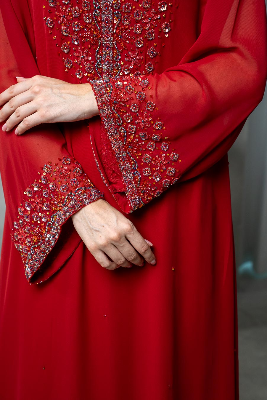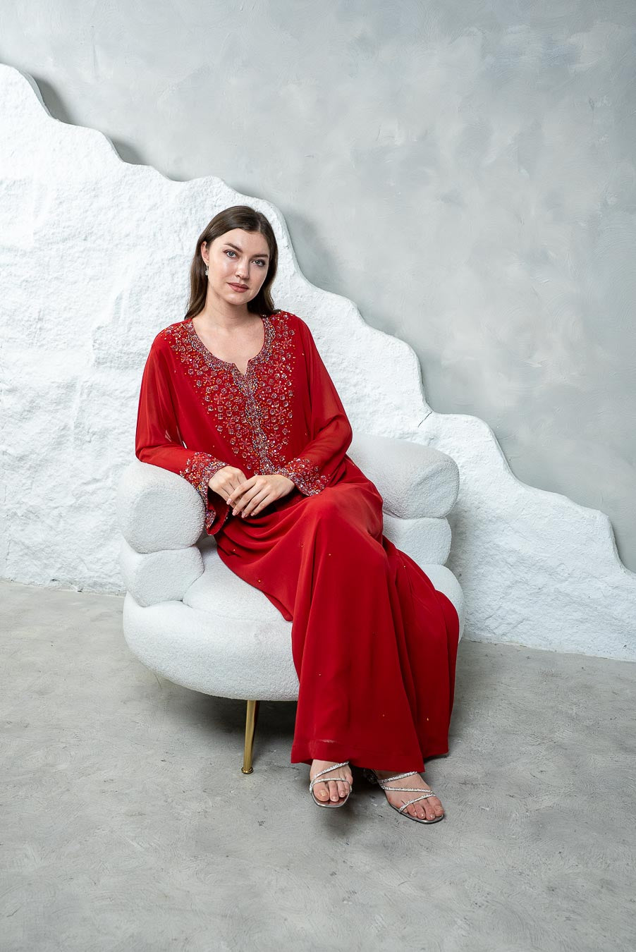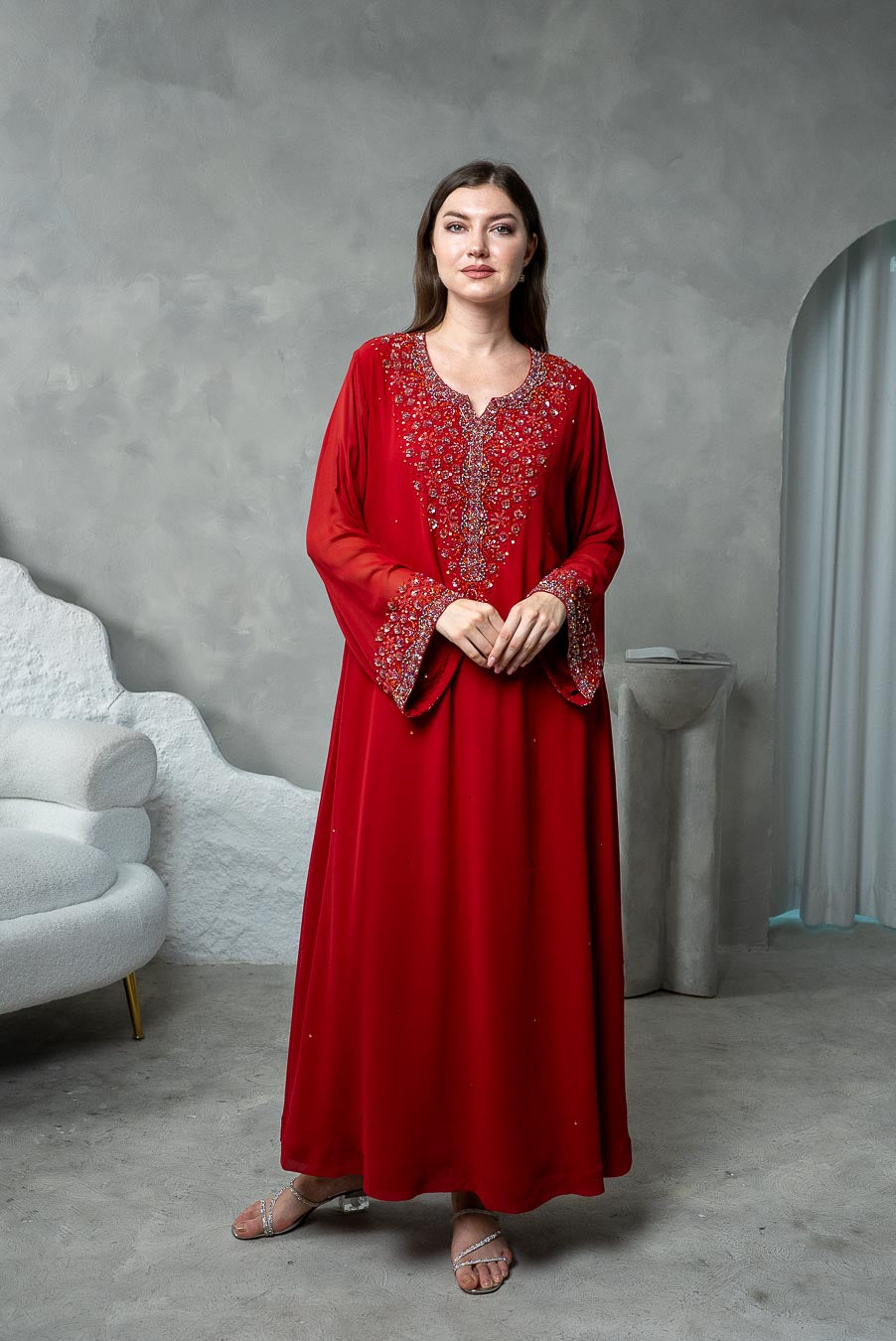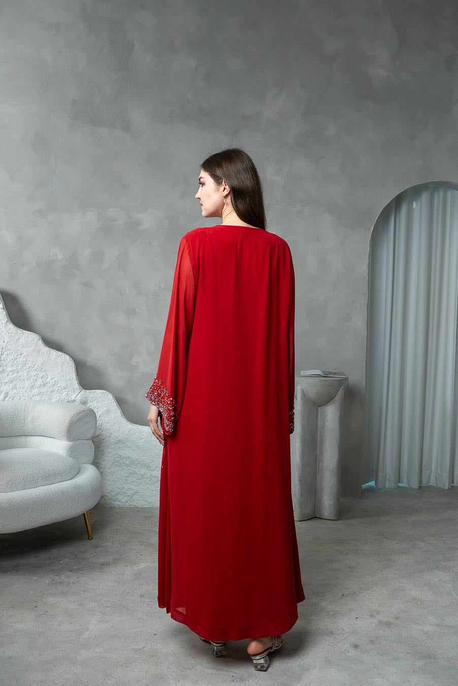 Crepe jalabiya with a klosh cut, featuring intricate handwork from the neckline to the waist and on the sleeves for a refined, graceful look.