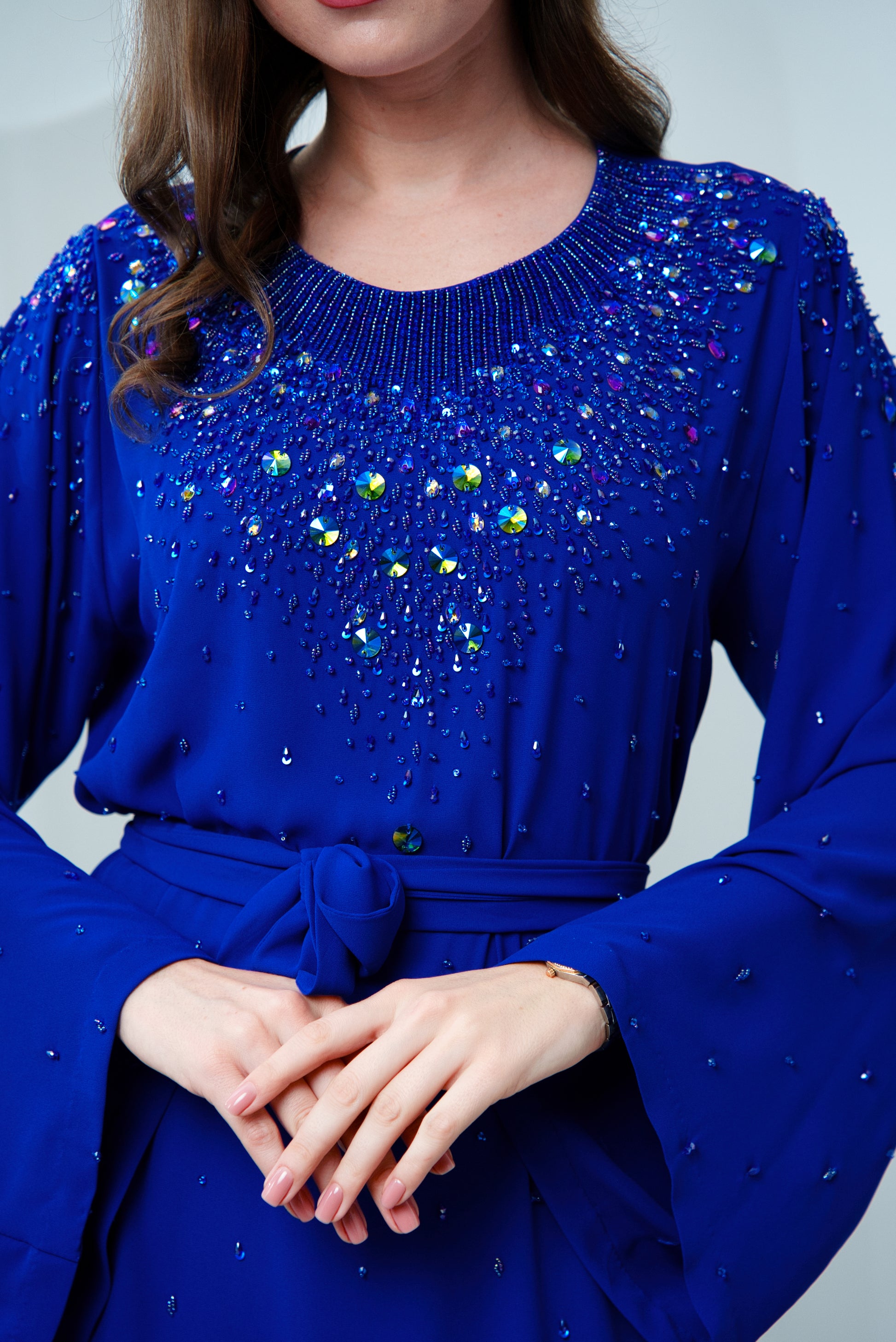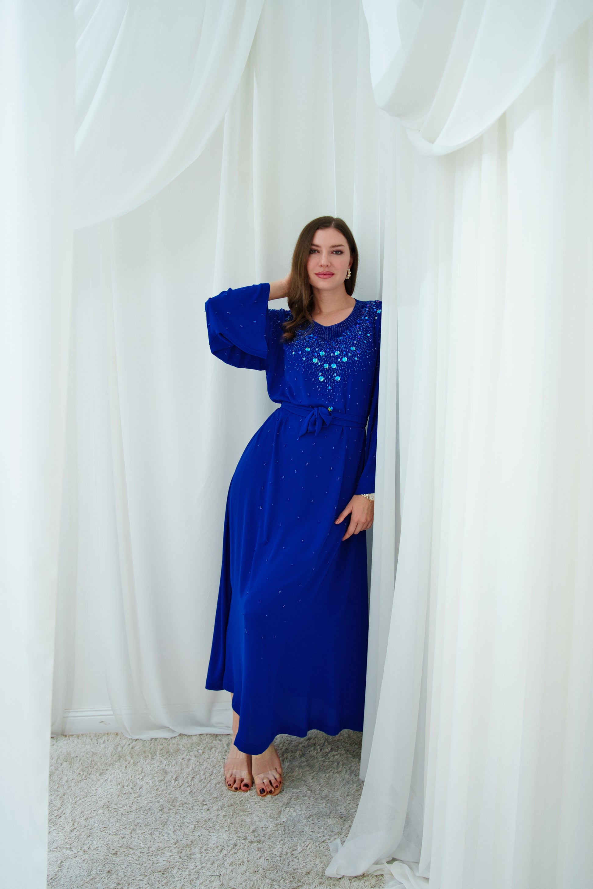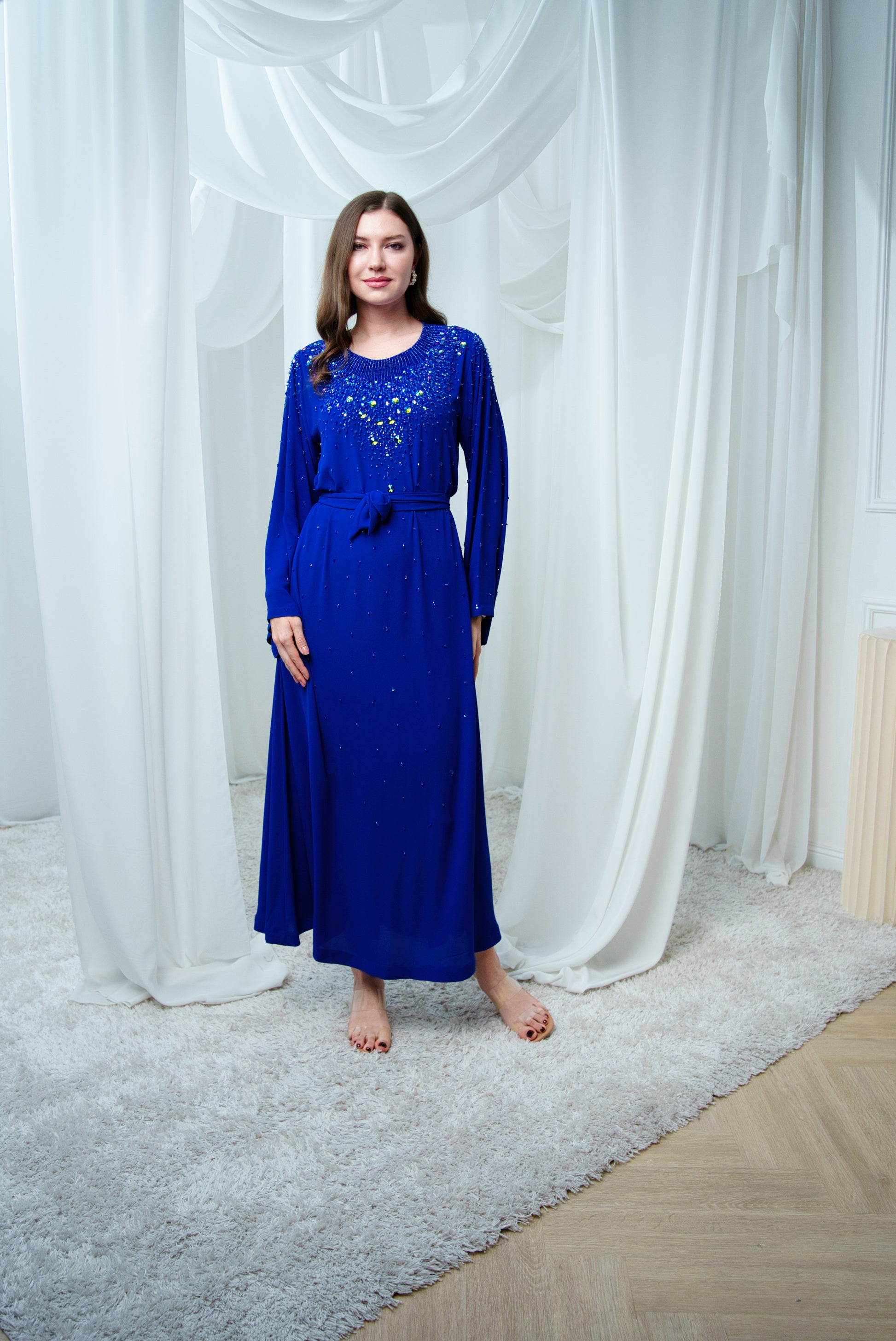 This crepe jalabiya features delicate bead detailing along the neckline, adding a subtle sparkle. Its soft fabric drapes beautifully for comfort and grace.