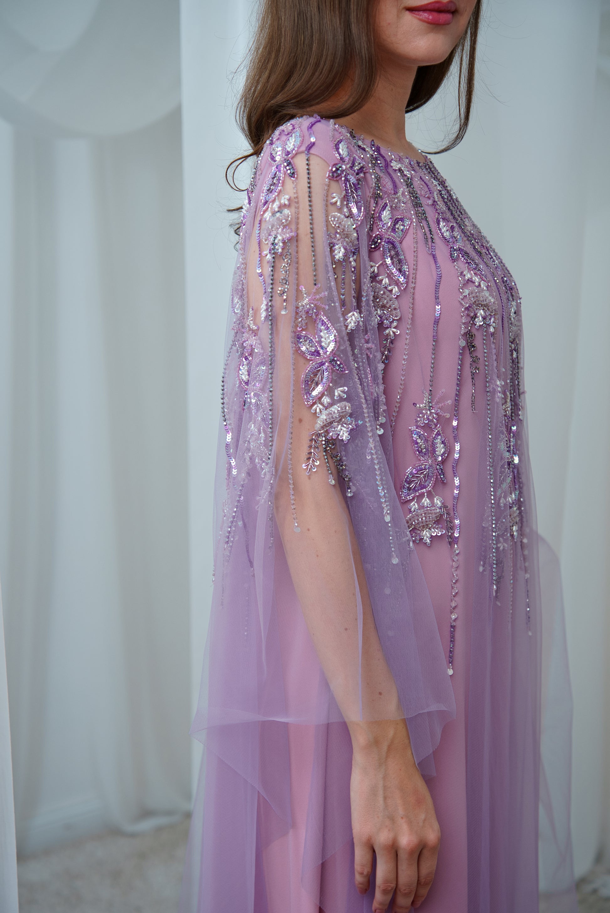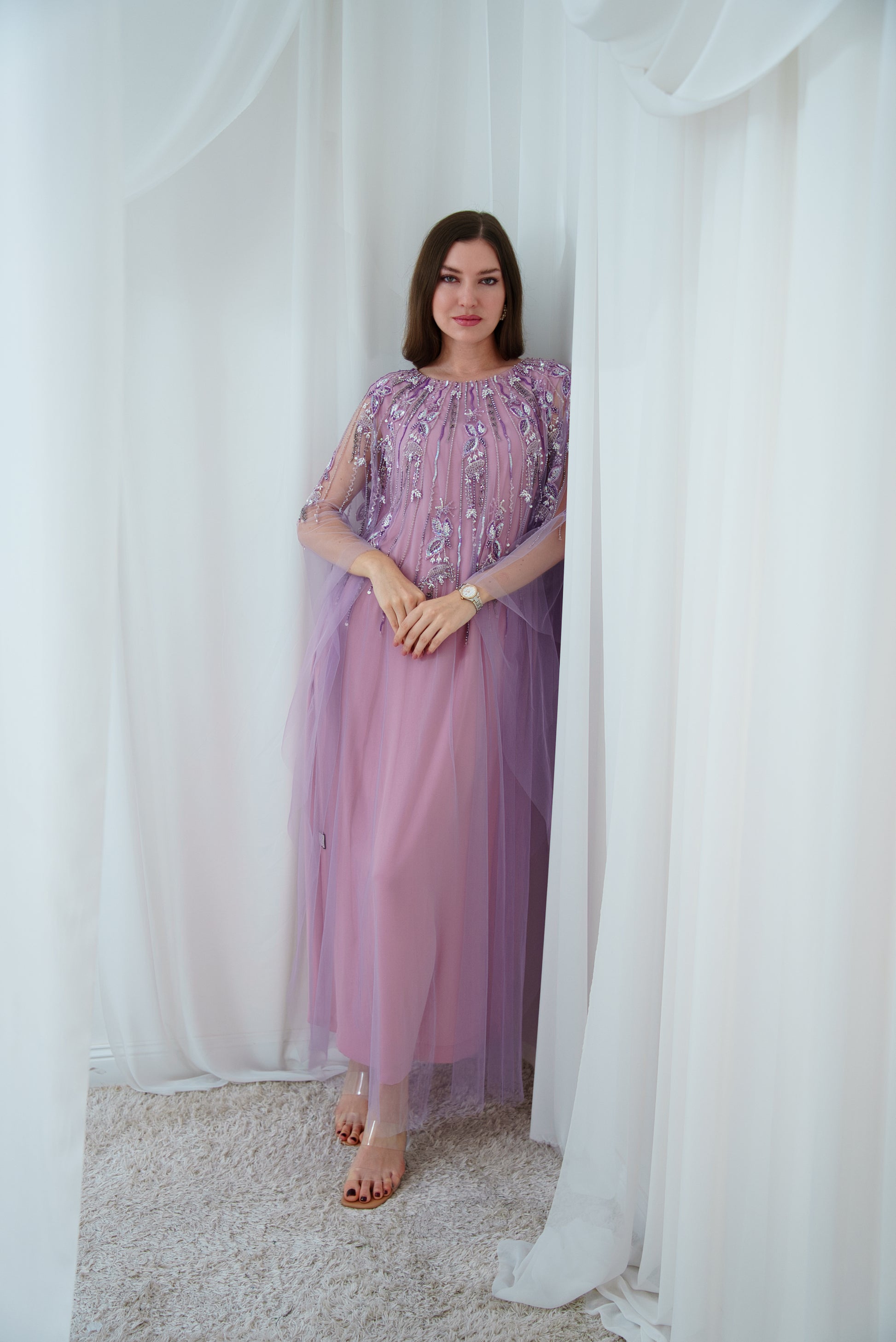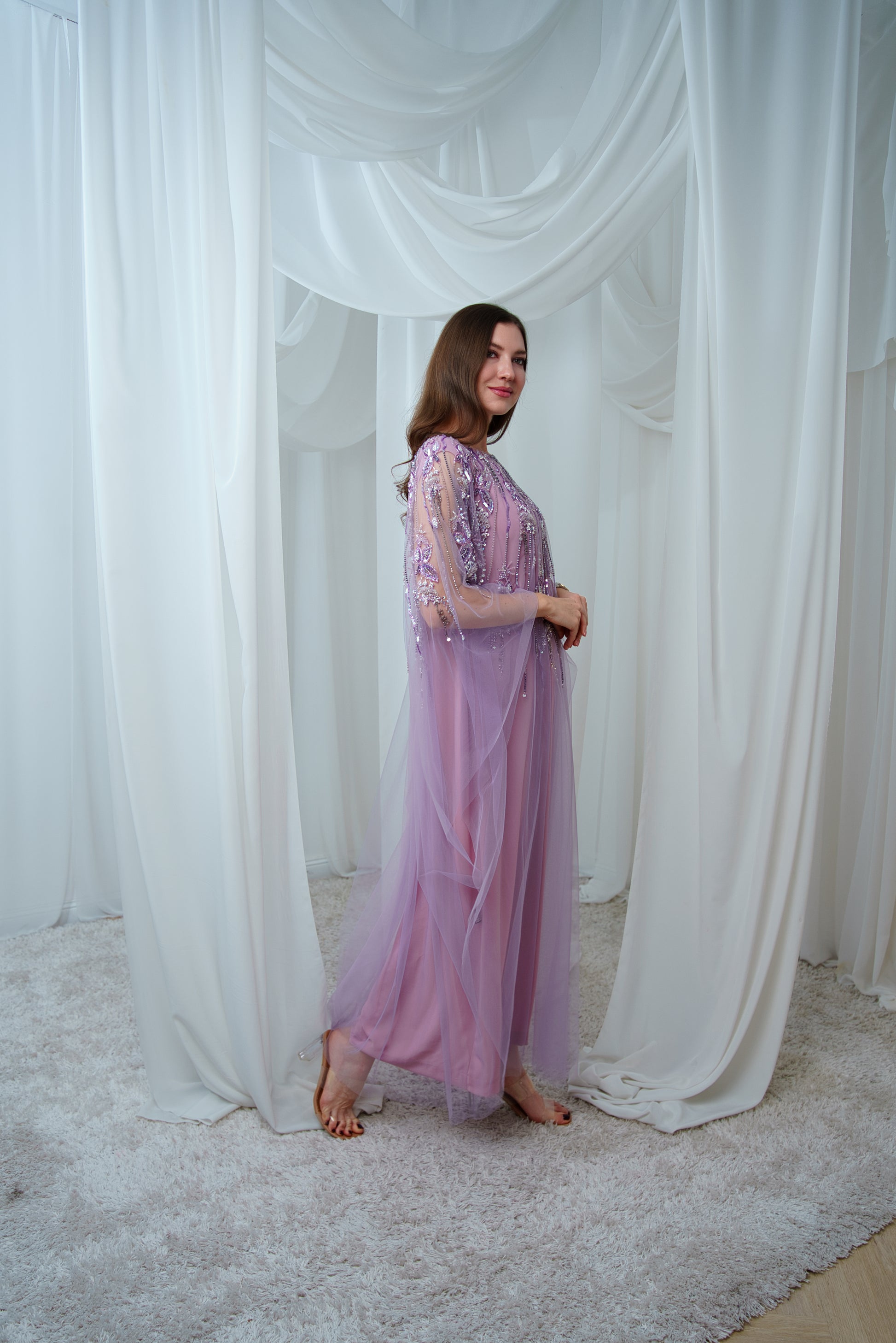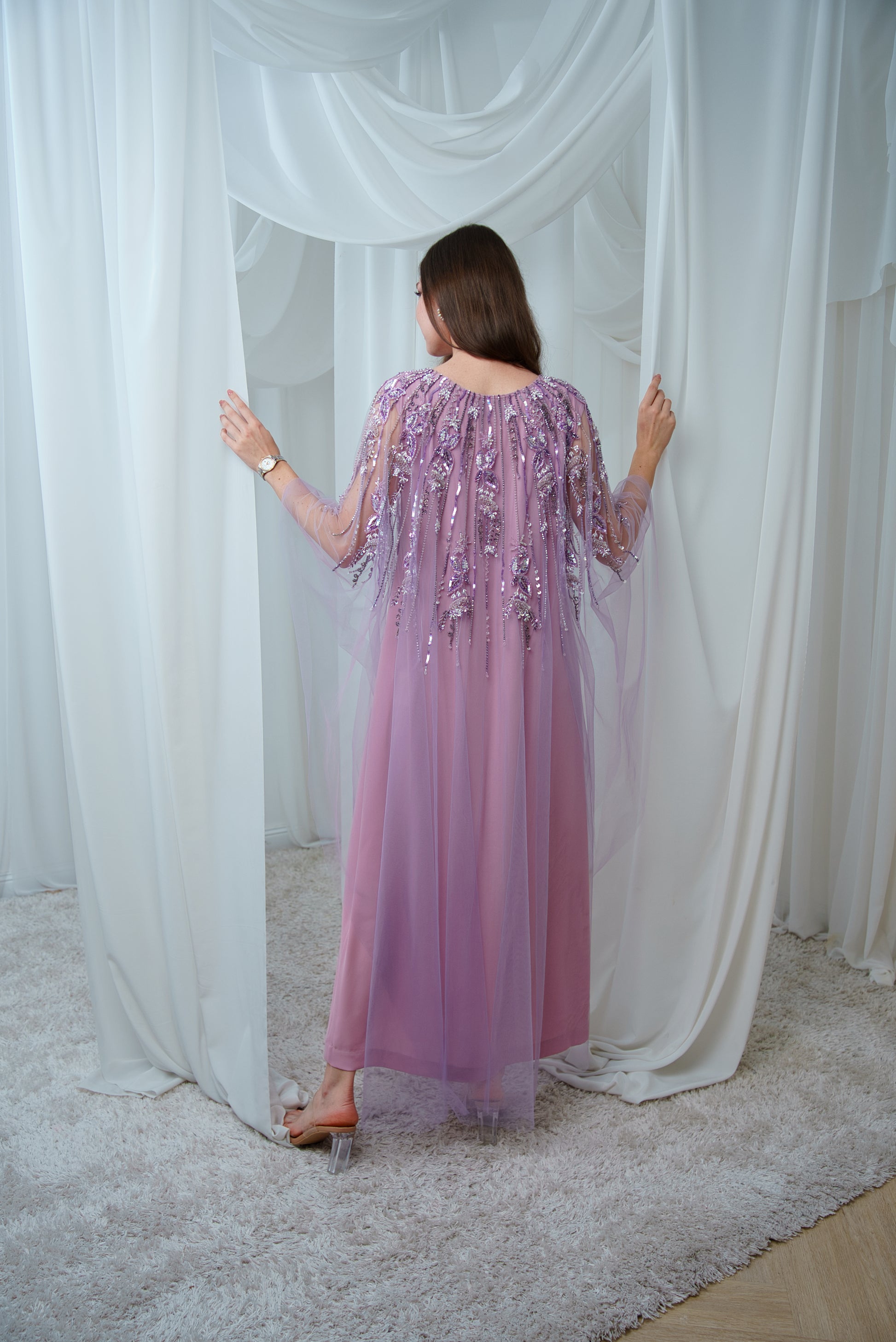 This tulle jalabiya is enhanced with intricate bead detailing, creating a soft, shimmering effect that adds charm to its flowing design.